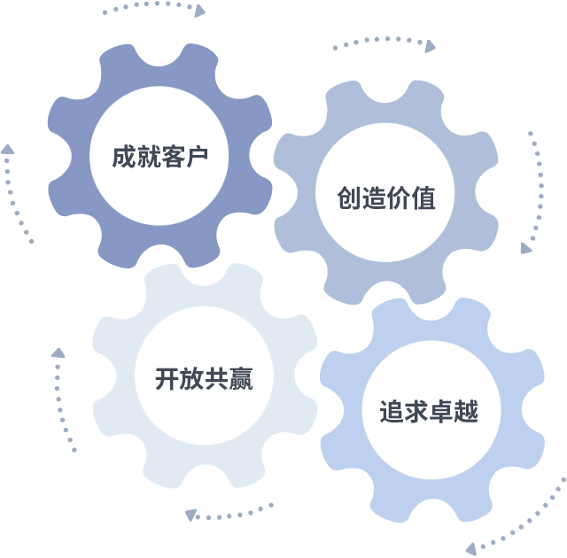 成就客户是一切决策的出发点,,创造价值是衡量所有工作的标准,,追求卓越是我们做事做人的态度,,开放共赢是我们的格局也是最终的结果。。价值观的齿轮环环相扣,,推动着组织里的每个人不断向前。。。